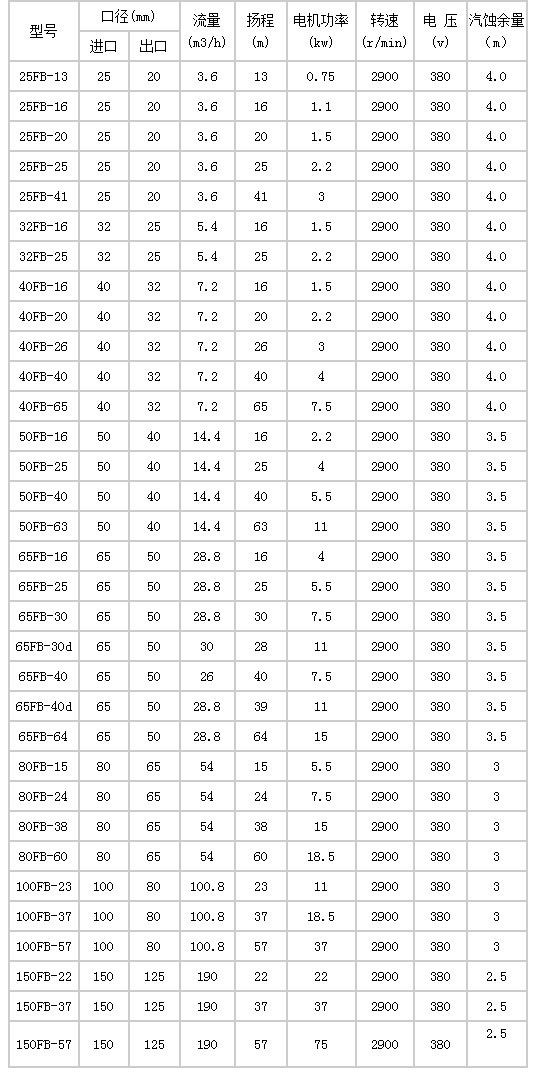 三(san)、技術參數: FB、AFB型耐腐(fǔ)蝕離心化工泵